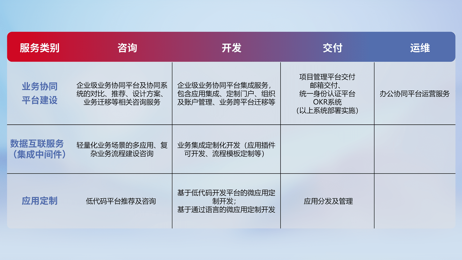 针对钉钉、、、企微、、、IDaas等平台级产品提供产品的规划、、、方案、、、、交付、、定制化开发等服务,,,实现如统一协同办公、、、智能客户服务、、混合会议管理、、智能数据查询、、、等业务场景,,,实现数字化转型。。。。